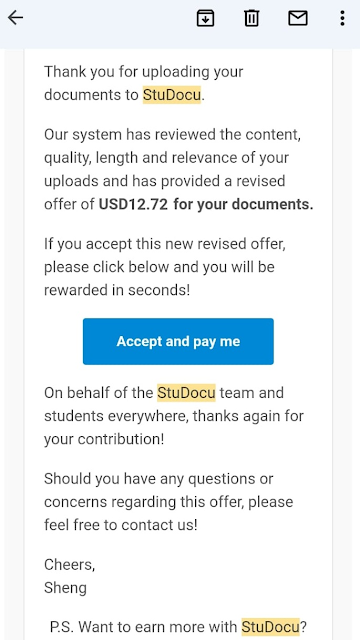Kamu bisa daftar langsung ke websitenya => https://www.studocu.com/ lewat hp, untuk daftar bisa menggunakan email pribadi kita, aku sarankan pake email yang sama dengan email paypal kamu, supaya tidak ribet nanti pembayarannya, tetapi untuk mengupload harus lewat PC